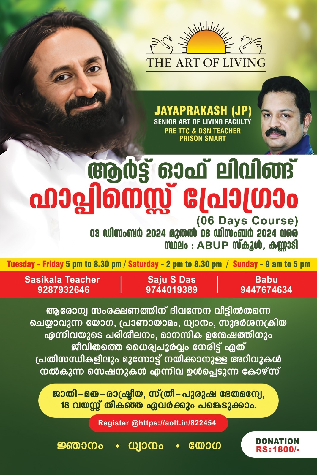 Starting Date : 03 December 2024, Tuesday Starting Time : 5 PM Ending Date : 08 December 2024, Sunday Ending Time : 8.30 PM Location : Kannadi, Palakkad Venue Address : ABUP School Contact Person : Saju S Das Contact Phone : 9744019389 Remarks : Posters : |