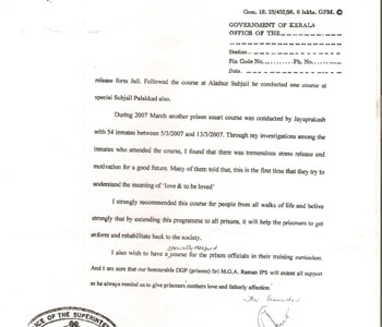 Testimonial from Superintendent, Sub Jail, Alathur after the Prison Smart Course (March 2007) |